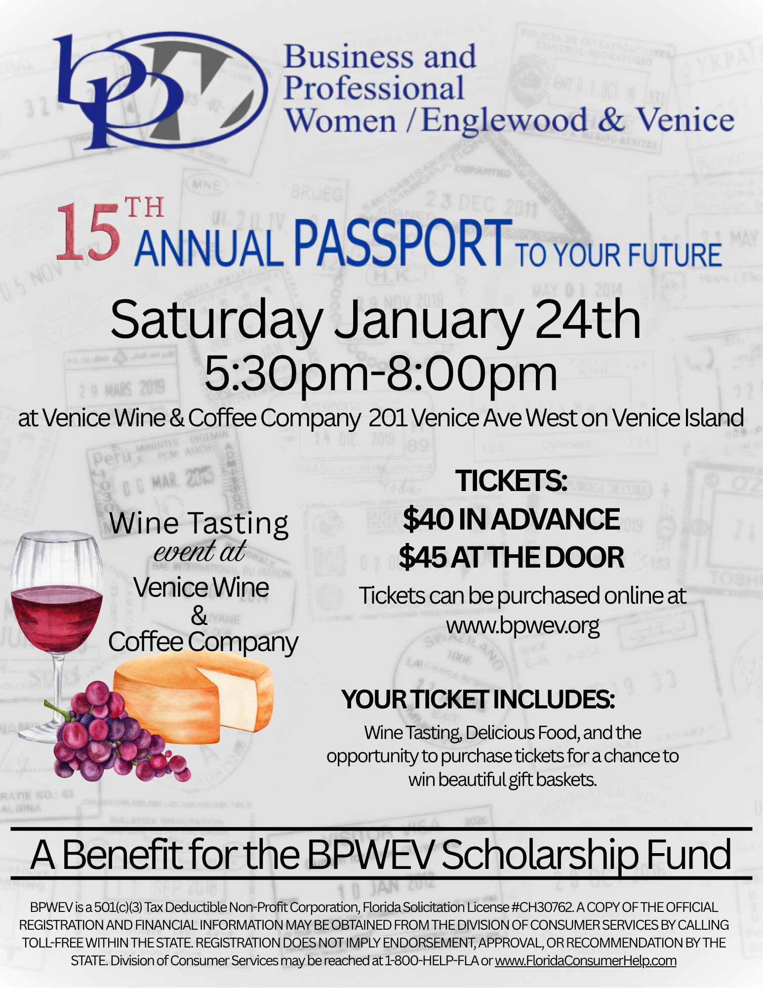 The Annual Wine Tasting is to promote BPWEV and benefit the BPWEV Scholarship Fund.